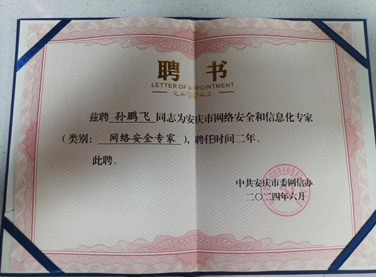 为发挥专家智库作用,提高网信工作决策的科学性,中共安庆市委网信办组织遴选并研究确定了2024年度安庆市网络安全和信息化专家。公司教师孙鹏飞受聘担任网络安全专家。