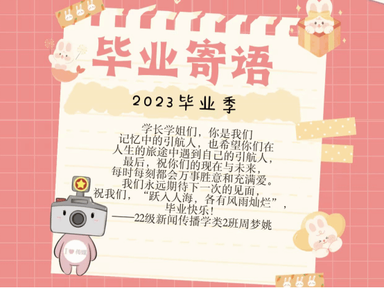 “希望你们在人生的旅途中遇到自己的引航人,祝你们的现在与未来每时每刻都会万事胜意和充满爱,毕业快乐!” 新闻传播学类专业2022(2)班的周梦姚希望自己真诚的祝福,可以给毕业生们带去温暖与喜悦。对于周梦姚来说,“毕业”尚且是一个遥远的词汇,但她想到了在学校的这一年里,受到许多来自学长学姐的帮助,因此她认真地写下了寄语,希望学长学姐能够前途似锦,也希望其他员工们对未来生活抱有憧憬和向往,接续奋斗。