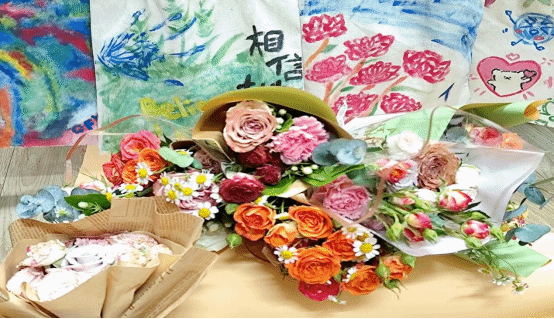 在活动筹备期间,各班班委提前了解员工们喜欢的花类品种,有茉莉、康乃馨、卡布奇诺、热情泡泡……负责人们购买对应花束后稍作修剪,避免枝刺划伤员工。活动开始前,负责人将花束、颜料、彩纸、帆布包等分类放置在桌上。