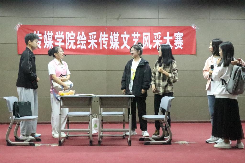比赛在新闻传播学类专业2021(6)班的诗歌朗诵《回眸》中拉开序幕。新闻传播类学专业2021(3)班的员工们给观众带来了小品《真假老师》,小品中张小明是独自居住在城市的男孩,由于缺少父母的关爱和教育,养成了不少不良习惯,最终在保洁员的点醒下,孩子与家长和解并且学会了相互理解。“我希望通过这个小品呼吁家长对孩子的教育与陪伴,而不仅仅是给孩子提供金钱来源。”新闻传播学类专业2021(3)班的李佳杰说。