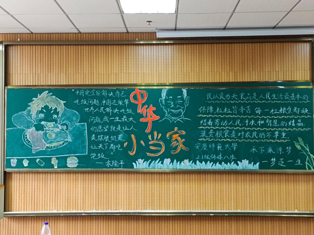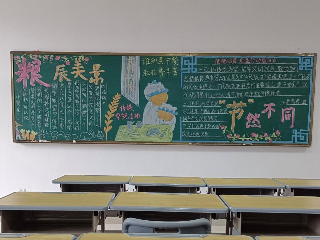 文明就餐的守则、呼吁性的标语、关于粮食的图案……新闻传播学类专业2021(7)班将黑板报分为“光盘行动倡议”和“勤俭节约标语”两个板块,以袁隆平院士的肖像、一袋粮食以及金黄色麦穗镶边作为宣传勤俭节约美德的标志元素。参与评比的其他班级也各发挥其所长,想出了不同的创意,完成了一幅幅优秀的黑板报作品。
