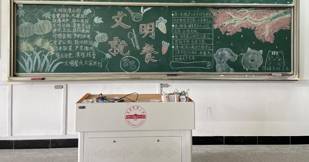 新闻传播学类专业2021(5)班将“食为政首,粮安天下”作为本次黑板报的主旋律。谈及黑板报的策划和想法时,新闻传播学类专业2021(5)班的付敏作为板报解说员说:“右侧延伸出来的樱花树和散落的樱花以及可爱的小动物,表达我们对文明就餐活动的殷切期望和对文明就餐习惯在安庆师大校园蔚然成风的坚定信念。”她表示,除了板报样式外,他们还通过古文对于文明就餐的一些观点进行展示,希望引发大家的共鸣与思考。”