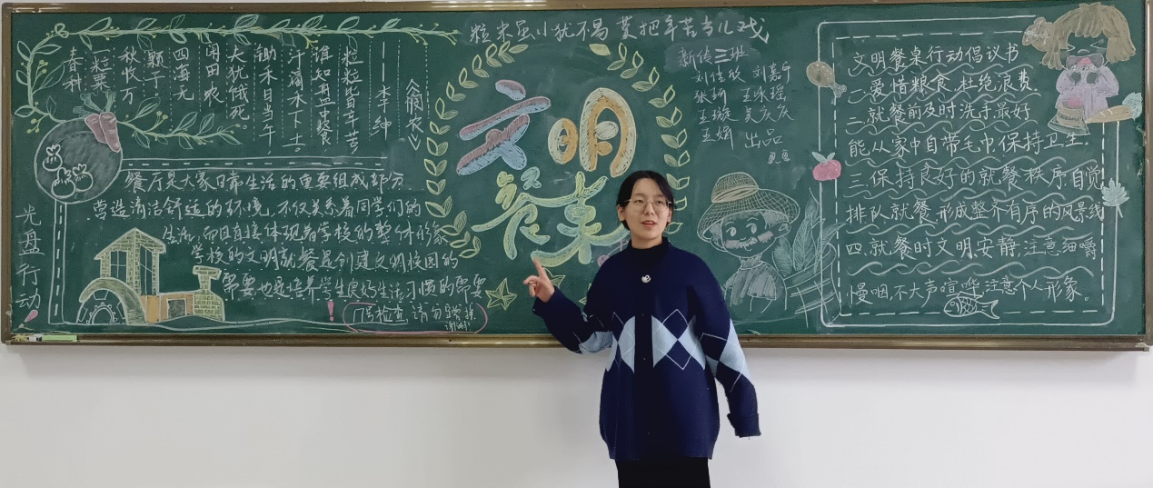 “粒米虽小犹不易,莫把辛苦当儿戏”,这是新闻传播学类2021(3)班的黑板报作品主题。据班级黑板报解说员、新闻传播学类专业2021(3)班的刘佳欣介绍,制作黑板报的员工们克服了资料有限、材料有限等困难,从文字内容、排版、图画三方面入手,着重突出了农民伯伯的形象,并以树叶、麦穗等元素作为辅助。“我们在板报中提出了在餐厅‘文明就餐’的意义,以一首耳熟能详的古诗警示大家,又以倡议书再次倡导大家‘文明就餐’。”