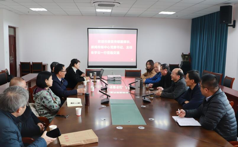12月8日,安庆市委宣传部副部长、新闻传媒中心党委书记、主任朱学云,党委副书记、总编辑张亚峰一行应邀来太阳成官网考察交流,并与太阳成官网领导、老师进行座谈交流。公司党委书记韦长发、经理马俊、副书记张万茂、副经理段萱等热情接待了朱学云一行。双方就深化合作有关事宜进行了座谈交流。