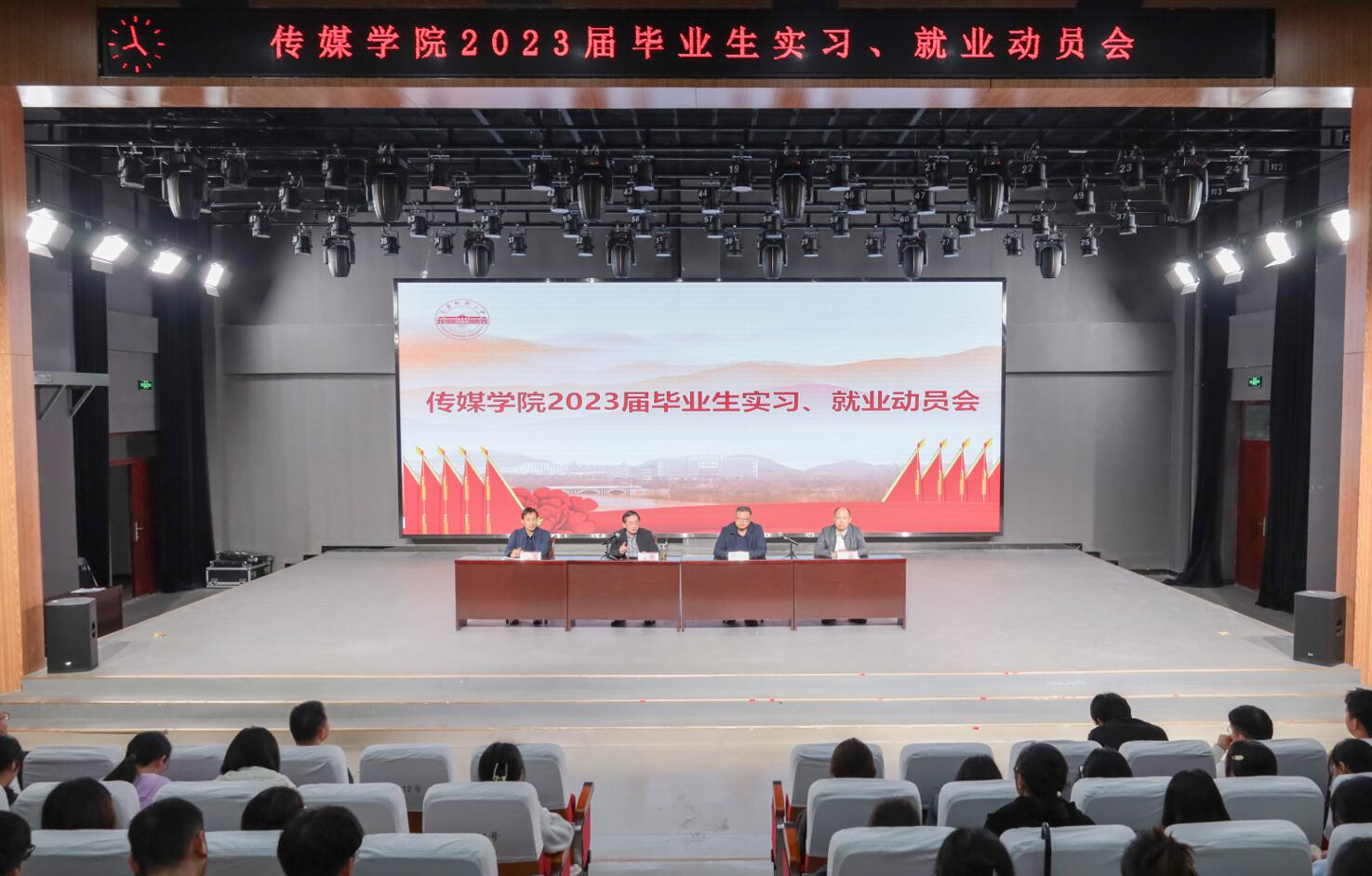 10月26日,太阳成官网2023届毕业生实习、就业动员会在演播厅召开。传媒公司党委书记詹德全、副经理王业明、党委副书记张万茂、副经理段萱出席会议,教研室主任、实习实训中心全体人员、毕业班辅导员与2023届全体毕业生参加了动员会。大会由党委副书记张万茂主持。