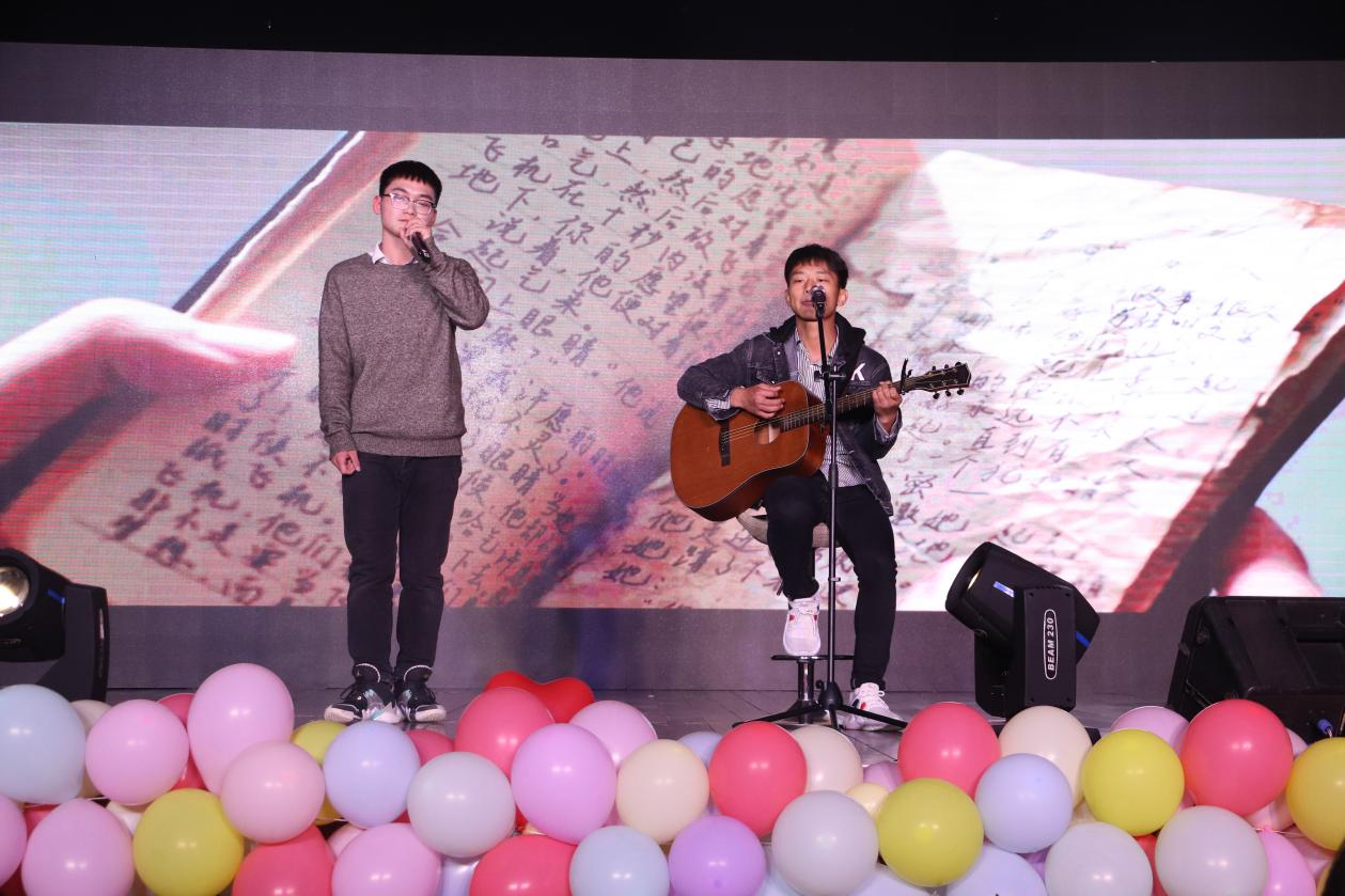 “忘不了你的爱,但结局难更改,我没能把你留下来……”一首《男孩》成功地将会场的氛围燃了起来。手握话筒、弹着吉他,来自2019级的田佳宇和梅纯光以饱含热情的声音和帅气洒脱的形象征服了现场观众。