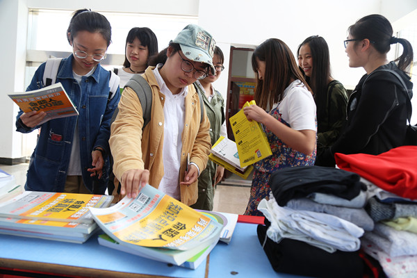 正在为考研做准备的广播电视学2014级孙燕婉,在活动现场精心挑选了4本与政治有关的教辅资料,“学长学姐留下来的这些资料对我们考研很有帮助,我很感谢他们。”她认为,这是一个很温暖的活动,寄托着学长与学姐真挚的关怀,明年她也想捐赠和分享一些书籍、笔记,作为一种爱的接力。(文/员工记者 汪艳 郭永生 图/员工记者 刘敏)