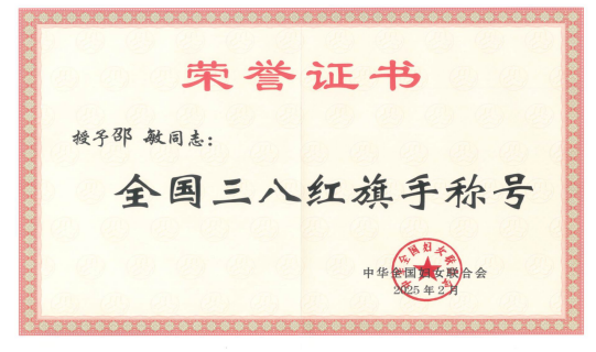 近日,全国妇联在京举行纪念“三八”国际妇女节暨表彰大会。大会表彰了10名全国三八红旗手标兵、596名全国三八红旗手、395个全国三八红旗集体、599个全国巾帼文明岗。公司教师邵敏教授荣获2024年度全国三八红旗手称号。