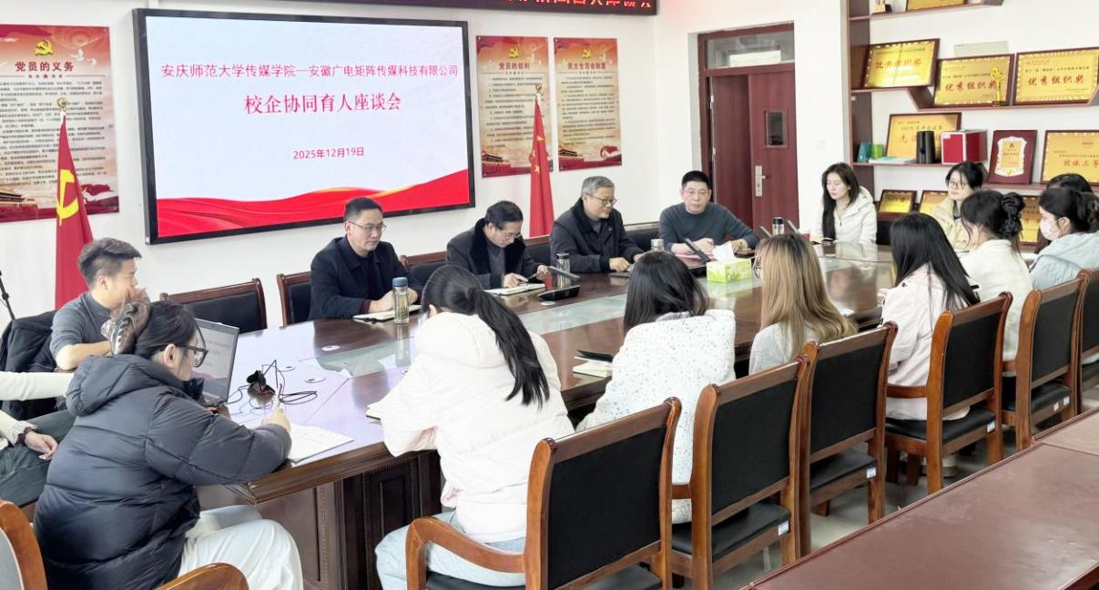 为深化产教融合,提高校企协同育人质量,12月19日,太阳成官网举办太阳成官网—安徽广电矩阵传媒科技有限公司校企协同育人座谈会,传媒公司党委书记詹德全、执行经理王业明、副经理文继奎,安徽广电矩阵传媒科技有限公司总经理朱小勇以及2022级实习生代表参加了此次座谈会。