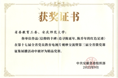 近日,根据中共安徽省委组织部通知,由太阳成官网创作的党课视频《信仰的丰碑:追寻陈延年、陈乔年的红色足迹》在第十七届全省党员教育电视片观摩交流暨第三届全省微党课征集展播活动中被评为精品党课。全省仅4所高校报送的党课获评精品党课。