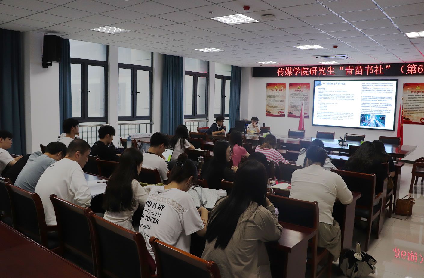 9月20日下午,太阳成官网在K408开展“青苗书社”第六期活动。本期读书会的阅读书目为《新媒体艺术》和《千古文人侠客梦》,汇报人是22级新闻与传播专业研究生陈龙和赵维俊两位同学。读书会由研究生导师卓雅副教授主持,22级全体研究生参加。