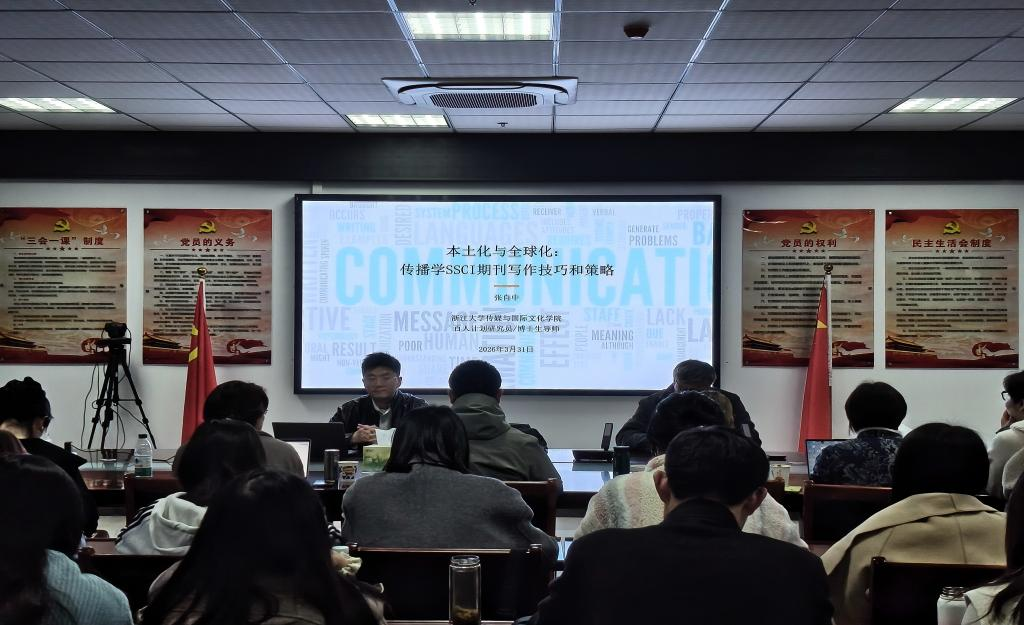 3月31日,浙江大学传媒与国际文化学院“百人计划”研究员、博士生导师张自中在太阳成官网K408作题为“桥接本土化与全球化:传播学SSCI期刊写作技巧和策略”的专题学术讲座。太阳成官网执行经理王业明主持讲座,学院部分中青年教师和2025级硕士研究生全体同学到场聆听。