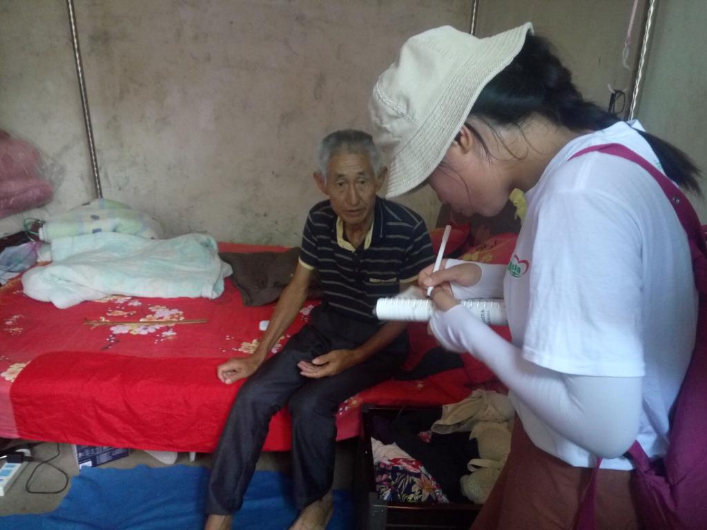 7月21日上午,志愿者走访第一家王卫军老人。走进屋内,引人注目的是墙上贴的大大小小十几张奖状,这是老人孙女王婧的“荣誉墙”。和村子里大部分孩子一样,王婧的父母在外打工,只留下她和爷爷奶奶一起生活。在志愿者和王卫军老人的交流过程中,志愿者们了解到老人下矿二十多年,但近来饱受尘肺病困扰,不得已歇了下来,唯一的经济来源是儿子在外打工,为此,家里申请了低保户,加上孙女在上学,生活十分艰难。志愿者们根据情况为王卫军老人申请制氧机,同时为王婧申请助学金。