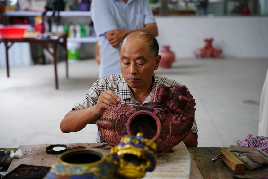 参观过程中,团队也采访了桐城“掐丝珐琅”工艺的领军人物——“江淮名匠”项道友。作为桐城“掐丝珐琅”工艺的传承者,他自小热爱中国传统文化,专业从事传统工艺品设计、制作已有30余年,他精心钻研绘画和制作技巧,一丝不苟地把热爱当作事业,在掐丝珐琅的制作和创新上进行了大量的尝试,2015车,其珐琅作品《生肖羊》入选安徽博物院主办的羊年新春特展,2019年,其珐琅作品《莲台六合瑞兽炉》荣获全国非遗传承人作品联展金奖。