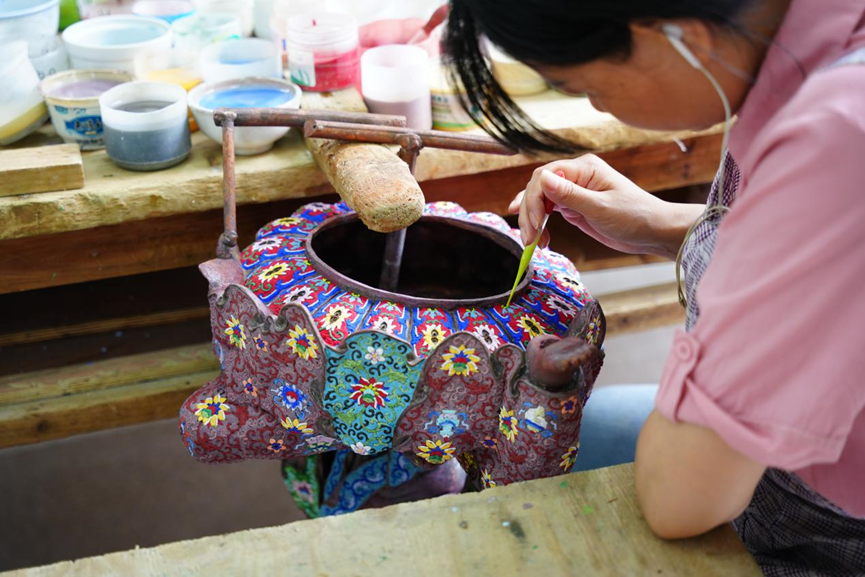 暑期社会实践团成员走进桐城辉煌艺术公司,参观掐丝珐琅的生产制作车间,领略掐丝珐琅艺术的精湛工艺和深厚的文化底蕴。所谓“一件珐琅百道工”,作为一种集设计、雕刻、铸造、掐丝、錾刻等多种工艺于一体的复杂传统技艺,每件作品都需耗费工匠数月甚至数年心血。2008年,“胎铸掐丝珐琅”入选安徽省第二批非物质文化遗产保护名录。