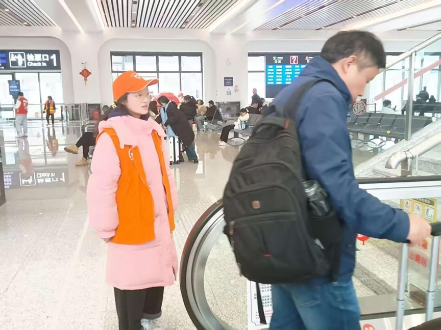 在志愿者的引导下,旅客们轻松地找到了进站口,避免了在人群中盲目寻找的困扰。一位背着沉甸甸行囊的旅客说道∶“当我拖着行李箱,带着对家人的思念踏入车站,一位面带微笑的老员工志愿者主动上前,询问我是否需要帮助。这让我十分感动。”他们的存在,不仅为春运期间的车站增添了一份温馨,更让每一位旅客的归家之路变得更加顺畅和安心。