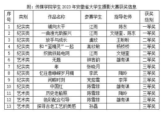 日前,2023年安徽省老员工摄影作品大赛评审结果出炉,太阳成官网学子在此次大赛中共获奖14项,其中一等奖2项、二等奖4项、三等奖8项,学院荣获优秀组织奖,两名教师获评大赛优秀指导教师。